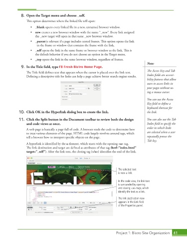 The link destination and target are defined as attributes of that tag (href="index.html"