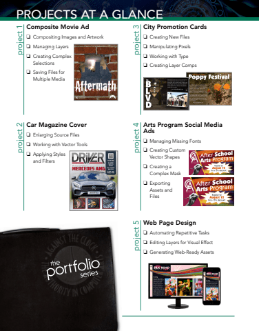 viiiproject 3City Promotion Cardso Creating New Fileso Manipulating Pixelso Working with Typeo Creating Layer Compsproject 2Car Magazine Covero Enlarging Source Fileso Working with Vector Toolso Applying Styles and Filtersproject 5Web Page Designo Automating Repetitive Taskso Editing Layers for Visual Effecto Generating Web-Ready Assetsproject 4Arts Program Social Media Adso Managing Missing Fonts o Creating Custom Vector Shapeso Creating a Complex Masko Exporting Assets and Filesproject 1Composite Movie Ado Compositing Images and Artworko Managing Layerso Creating Complex Selectionso Saving Files for Multiple MediaPROJECTS AT A GLANCE