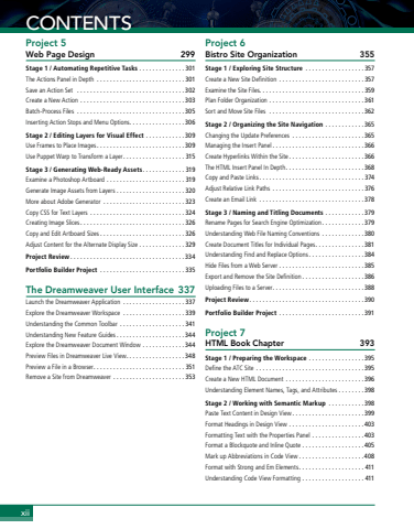 xiiCONTENTSProject 5Web Page Design 299Stage 1 / Automating Repetitive Tasks . . . . . . . . . . . . . 301The Actions Panel in Depth . . . . . . . . . . . . . . . . . . . . . . . . . . 301Save an Action Set . . . . . . . . . . . . . . . . . . . . . . . . . . . . . . . . 302Create a New Action . . . . . . . . . . . . . . . . . . . . . . . . . . . . . . . 303Batch-Process Files . . . . . . . . . . . . . . . . . . . . . . . . . . . . . . . . 305Inserting Action Stops and Menu Options . . . . . . . . . . . . . . . . 306Stage 2 / Editing Layers for Visual Effect . . . . . . . . . . . 309Use Frames to Place Images . . . . . . . . . . . . . . . . . . . . . . . . . . 309Use Puppet Warp to Transform a Layer . . . . . . . . . . . . . . . . . . 315Stage 3 / Generating Web-Ready Assets . . . . . . . . . . . . 319Examine a Photoshop Artboard . . . . . . . . . . . . . . . . . . . . . . . 319Generate Image Assets from Layers..................... 320More about Adobe Generator . . . . . . . . . . . . . . . . . . . . . . . . 323Copy CSS for Text Layers . . . . . . . . . . . . . . . . . . . . . . . . . . . . 324Creating Image Slices . . . . . . . . . . . . . . . . . . . . . . . . . . . . . . . 326Copy and Edit Artboard Sizes . . . . . . . . . . . . . . . . . . . . . . . . . 326Adjust Content for the Alternate Display Size . . . . . . . . . . . . . 329Project Review . . . . . . . . . . . . . . . . . . . . . . . . . . . . . . . . . . 334Portfolio Builder Project . . . . . . . . . . . . . . . . . . . . . . . . . 335The Dreamweaver User Interface 337Launch the Dreamweaver Application . . . . . . . . . . . . . . . . . . 337Explore the Dreamweaver Workspace . . . . . . . . . . . . . . . . . . 339Understanding the Common Toolbar . . . . . . . . . . . . . . . . . . . 341Understanding New Feature Guides . . . . . . . . . . . . . . . . . . . . 344Explore the Dreamweaver Document Window . . . . . . . . . . . . 344Preview Files in Dreamweaver Live View . . . . . . . . . . . . . . . . . 348Preview a File in a Browser . . . . . . . . . . . . . . . . . . . . . . . . . . . 351Remove a Site from Dreamweaver . . . . . . . . . . . . . . . . . . . . . 353Project 6Bistro Site Organization 355Stage 1 / Exploring Site Structure . . . . . . . . . . . . . . . . . 357Create a New Site Definition . . . . . . . . . . . . . . . . . . . . . . . . . 357Examine the Site Files . . . . . . . . . . . . . . . . . . . . . . . . . . . . . . . 359Plan Folder Organization . . . . . . . . . . . . . . . . . . . . . . . . . . . . 361Sort and Move Site Files . . . . . . . . . . . . . . . . . . . . . . . . . . . . 362Stage 2 / Organizing the Site Navigation . . . . . . . . . . . 365Changing the Update Preferences . . . . . . . . . . . . . . . . . . . . . 365Managing the Insert Panel . . . . . . . . . . . . . . . . . . . . . . . . . . . 366Create Hyperlinks Within the Site . . . . . . . . . . . . . . . . . . . . . . 366The HTML Insert Panel In Depth . . . . . . . . . . . . . . . . . . . . . . . 368Copy and Paste Links . . . . . . . . . . . . . . . . . . . . . . . . . . . . . . . 374Adjust Relative Link Paths . . . . . . . . . . . . . . . . . . . . . . . . . . . 376Create an Email Link . . . . . . . . . . . . . . . . . . . . . . . . . . . . . . . 378Stage 3 / Naming and Titling Documents . . . . . . . . . . . 379Rename Pages for Search Engine Optimization . . . . . . . . . . . . 379Understanding Web File Naming Conventions . . . . . . . . . . . . 380Create Document Titles for Individual Pages . . . . . . . . . . . . . . 381Understanding Find and Replace Options . . . . . . . . . . . . . . . . 384Hide Files from a Web Server . . . . . . . . . . . . . . . . . . . . . . . . . 385Export and Remove the Site Definition . . . . . . . . . . . . . . . . . . 386Uploading Files to a Server . . . . . . . . . . . . . . . . . . . . . . . . . . . 388Project Review . . . . . . . . . . . . . . . . . . . . . . . . . . . . . . . . . . 390Portfolio Builder Project . . . . . . . . . . . . . . . . . . . . . . . . . 391Project 7HTML Book Chapter 393Stage 1 / Preparing the Workspace . . . . . . . . . . . . . . . . 395Define the ATC Site . . . . . . . . . . . . . . . . . . . . . . . . . . . . . . . . 395Create a New HTML Document . . . . . . . . . . . . . . . . . . . . . . . 396Understanding Element Names, Tags, and Attributes . . . . . . . 398Stage 2 / Working with Semantic Markup . . . . . . . . . . 398Paste Text Content in Design View . . . . . . . . . . . . . . . . . . . . . 399Format Headings in Design View . . . . . . . . . . . . . . . . . . . . . . 403Formatting Text with the Properties Panel . . . . . . . . . . . . . . . 403Format a Blockquote and Inline Quote . . . . . . . . . . . . . . . . . . 405Mark up Abbreviations in Code View . . . . . . . . . . . . . . . . . . . 408Format with Strong and Em Elements . . . . . . . . . . . . . . . . . . . . 411Understanding Code View Formatting . . . . . . . . . . . . . . . . . . . 411