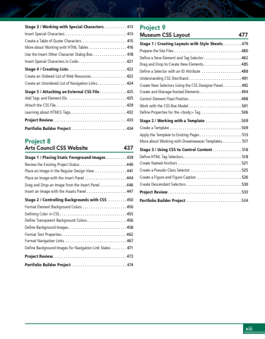 xiiiStage 3 / Working with Special Characters . . . . . . . . . . 413Insert Special Characters . . . . . . . . . . . . . . . . . . . . . . . . . . . . 413Create a Table of Quote Characters . . . . . . . . . . . . . . . . . . . . 415More about Working with HTML Tables . . . . . . . . . . . . . . . . . 416Use the Insert Other Character Dialog Box................ 418Insert Special Characters in Code . . . . . . . . . . . . . . . . . . . . . . 421Stage 4 / Creating Lists . . . . . . . . . . . . . . . . . . . . . . . . . . . 422Create an Ordered List of Web Resources . . . . . . . . . . . . . . . . 422Create an Unordered List of Navigation Links . . . . . . . . . . . . . 424Stage 5 / Attaching an External CSS File . . . . . . . . . . . . 425Add Tags and Element IDs . . . . . . . . . . . . . . . . . . . . . . . . . . . 425Attach the CSS File . . . . . . . . . . . . . . . . . . . . . . . . . . . . . . . . . 429Learning about HTML5 Tags . . . . . . . . . . . . . . . . . . . . . . . . . . 432Project Review . . . . . . . . . . . . . . . . . . . . . . . . . . . . . . . . . . 433Portfolio Builder Project . . . . . . . . . . . . . . . . . . . . . . . . . 434Project 8Arts Council CSS Website 437Stage 1 / Placing Static Foreground Images . . . . . . . . . 439Review the Existing Project Status . . . . . . . . . . . . . . . . . . . . . 440Place an Image in the Regular Design View . . . . . . . . . . . . . . 441Place an Image with the Insert Panel . . . . . . . . . . . . . . . . . . . 444Drag and Drop an Image from the Insert Panel . . . . . . . . . . . . 446Insert an Image with the Assets Panel . . . . . . . . . . . . . . . . . . 447Stage 2 / Controlling Backgrounds with CSS . . . . . . . . 450Format Element Background Colors . . . . . . . . . . . . . . . . . . . . 450Defining Color in CSS . . . . . . . . . . . . . . . . . . . . . . . . . . . . . . . 455Define Transparent Background Colors . . . . . . . . . . . . . . . . . . 456Define Background Images . . . . . . . . . . . . . . . . . . . . . . . . . . . 458Format Text Properties . . . . . . . . . . . . . . . . . . . . . . . . . . . . . . 462Format Navigation Links . . . . . . . . . . . . . . . . . . . . . . . . . . . . 467Define Background Images for Navigation Link States . . . . . . 471Project Review . . . . . . . . . . . . . . . . . . . . . . . . . . . . . . . . . . 473Portfolio Builder Project . . . . . . . . . . . . . . . . . . . . . . . . . 474Project 9Museum CSS Layout 477Stage 1 / Creating Layouts with Style Sheets . . . . . . . . 479Prepare the Site Files . . . . . . . . . . . . . . . . . . . . . . . . . . . . . . . 480Define a New Element and Tag Selector . . . . . . . . . . . . . . . . . 482Drag and Drop to Create New Elements . . . . . . . . . . . . . . . . . 485Define a Selector with an ID Attribute . . . . . . . . . . . . . . . . . . 488Understanding CSS Shorthand . . . . . . . . . . . . . . . . . . . . . . . . 491Create New Selectors Using the CSS Designer Panel . . . . . . . . 492Create and Manage Nested Elements . . . . . . . . . . . . . . . . . . . 494Control Element Float Position . . . . . . . . . . . . . . . . . . . . . . . . 498Work with the CSS Box Model . . . . . . . . . . . . . . . . . . . . . . . . 501Define Properties for the Tag . . . . . . . . . . . . . . . . . . 506Stage 2 / Working with a Template . . . . . . . . . . . . . . . . 509Create a Template . . . . . . . . . . . . . . . . . . . . . . . . . . . . . . . . . 509Apply the Template to Existing Pages . . . . . . . . . . . . . . . . . . . . 513More about Working with Dreamweaver Templates . . . . . . . . . 517Stage 3 / Using CSS to Control Content . . . . . . . . . . . . . . 518Define HTML Tag Selectors . . . . . . . . . . . . . . . . . . . . . . . . . . . . 518Create Named Anchors . . . . . . . . . . . . . . . . . . . . . . . . . . . . . 521Create a Pseudo-Class Selector . . . . . . . . . . . . . . . . . . . . . . . 525Create a Figure and Figure Caption . . . . . . . . . . . . . . . . . . . . 526Create Descendant Selectors . . . . . . . . . . . . . . . . . . . . . . . . . 530Project Review . . . . . . . . . . . . . . . . . . . . . . . . . . . . . . . . . . 533Portfolio Builder Project . . . . . . . . . . . . . . . . . . . . . . . . . 534