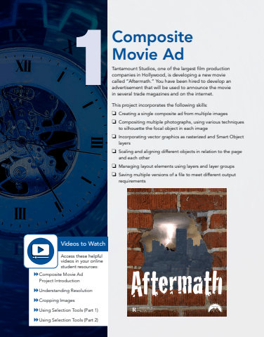 1%uf038Composite Movie AdProject Introduction%uf038Understanding Resolution%uf038Cropping Images%uf038Using Selection Tools (Part 1)%uf038Using Selection Tools (Part 2)Videos to WatchAccess these helpful videos in your online student resources:Tantamount Studios, one of the largest film production companies in Hollywood, is developing a new movie called %u201cAftermath.%u201d You have been hired to develop an advertisement that will be used to announce the movie in several trade magazines and on the internet. This project incorporates the following skills:o Creating a single composite ad from multiple imageso Compositing multiple photographs, using various techniques to silhouette the focal object in each imageo Incorporating vector graphics as rasterized and Smart Object layerso Scaling and aligning different objects in relation to the page and each othero Managing layout elements using layers and layer groupso Saving multiple versions of a file to meet different output requirementsComposite Movie Ad