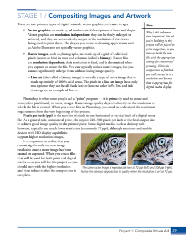 Project 1: Composite Movie Ad 29STAGE 1 / Compositing Images and ArtworkThere are two primary types of digital artwork: vector graphics and raster images. %u2022 Vector graphics are made up of mathematical descriptions of lines and shapes. Vector graphics are resolution independent; they can be freely enlarged or reduced, and they are automatically output at the resolution of the device being used to print them. The shapes you create in drawing applications such as Adobe Illustrator are typically vector graphics. %u2022 Raster images, such as photographs, are made up of a grid of individual pixels (rasters or bits) in rows and columns (called a bitmap). Raster files are resolution dependent; their resolution is fixed, and is determined when you capture or create the file. You can typically reduce raster images, but you cannot significantly enlarge them without losing image quality. %u2013 Line art (also called a bitmap image) is actually a type of raster image that is made up entirely of 100% solid areas. The pixels in a line-art image have only two options: they can be all black (on) or have no color (off). Pen-and-ink drawings are an example of line art. Photoshop is what some people call a %u201cpaint%u201d program %u2014 it is primarily used to create and manipulate pixel-based, or raster, images. Raster-image quality depends directly on the resolution at which the file is created. When you create files in Photoshop, you need to understand the resolution requirements from the very beginning of the process. Pixels per inch (ppi) is the number of pixels in one horizontal or vertical inch of a digital raster file. As a general rule, commercial print jobs require 240%u2013300 pixels per inch at the final output size to achieve good image quality in the printed piece. Some digital media, such as desktop web browsers, typically use much lower resolution (commonly 72 ppi), although monitors and mobile devices with HD display capabilities support higher-resolution images. It is important to realize that you cannot significantly increase image resolution once a raster image has been created or captured. When you create files that will be used for both print and digital media %u2014 as you will for this project %u2014 you should start with the higher resolution, and then reduce it after the composition is complete.The same raster image is reproduced here at 72 ppi (left) and 300 ppi (right). Notice the obvious degradation in quality when the resolution is set to 72 ppi.Note:Why is this information important? The ad you%u2019re building in this project will be placed in print magazines, so you have to build the new file with the appropriate settings for commercial printing. When the composition is finished, you will convert it to a resolution and format that is appropriate for digital media display.