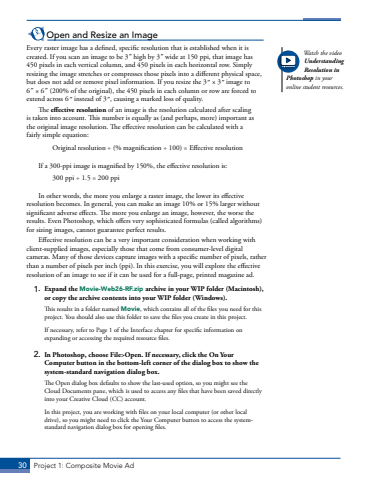 30 Project 1: Composite Movie AdOpen and Resize an ImageEvery raster image has a defined, specific resolution that is established when it is created. If you scan an image to be 3%u02dd high by 3%u02dd wide at 150 ppi, that image has 450 pixels in each vertical column, and 450 pixels in each horizontal row. Simply resizing the image stretches or compresses those pixels into a different physical space, but does not add or remove pixel information. If you resize the 3%u02dd%u00a0%u00d7%u00a03%u02dd image to 6%u02dd%u00a0%u00d7%u00a06%u02dd (200% of the original), the 450 pixels in each column or row are forced to extend across 6%u02dd instead of 3%u02dd, causing a marked loss of quality.The effective resolution of an image is the resolution calculated after scaling is taken into account. This number is equally as (and perhaps, more) important as the original image resolution. The effective resolution can be calculated with a fairly simple equation:Original resolution %u00f7 (% magnification %u00f7 100) = Effective resolutionIf a 300-ppi image is magnified by 150%, the effective resolution is:300 ppi %u00f7 1.5 = 200 ppiIn other words, the more you enlarge a raster image, the lower its effective resolution becomes. In general, you can make an image 10% or 15% larger without significant adverse effects. The more you enlarge an image, however, the worse the results. Even Photoshop, which offers very sophisticated formulas (called algorithms) for sizing images, cannot guarantee perfect results.Effective resolution can be a very important consideration when working with client-supplied images, especially those that come from consumer-level digital cameras. Many of those devices capture images with a specific number of pixels, rather than a number of pixels per inch (ppi). In this exercise, you will explore the effective resolution of an image to see if it can be used for a full-page, printed magazine ad.1. Expand the Movie-Web26-RF.zip archive in your WIP folder (Macintosh), or copy the archive contents into your WIP folder (Windows).This results in a folder named Movie, which contains all of the files you need for this project. You should also use this folder to save the files you create in this project.If necessary, refer to Page 1 of the Interface chapter for specific information on expanding or accessing the required resource files.2. In Photoshop, choose File>Open. If necessary, click the On Your Computer button in the bottom-left corner of the dialog box to show the system-standard navigation dialog box.The Open dialog box defaults to show the last-used option, so you might see the Cloud Documents pane, which is used to access any files that have been saved directly into your Creative Cloud (CC) account. In this project, you are working with files on your local computer (or other local drive), so you might need to click the Your Computer button to access the systemstandard navigation dialog box for opening files.Watch the video Understanding Resolution in Photoshop in your online student resources.