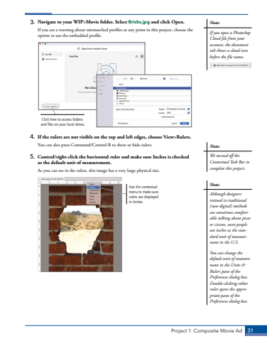 Project 1: Composite Movie Ad 313. Navigate to your WIP>Movie folder. Select Bricks.jpg and click Open.If you see a warning about mismatched profiles at any point in this project, choose the option to use the embedded profile.Click here to access folders and files on your local drives.4. If the rulers are not visible on the top and left edges, choose View>Rulers.You can also press Command/Control-R to show or hide rulers.5. Control/right-click the horizontal ruler and make sure Inches is checked as the default unit of measurement.As you can see in the rulers, this image has a very large physical size. Use the contextual menu to make sure rulers are displayed in Inches.Note:Although designers trained in traditional (non-digital) methods are sometimes comfortable talking about picas or ciceros, most people use inches as the standard unit of measurement in the U.S. You can change the default unit of measurement in the Units & Rulers pane of the Preferences dialog box. Double-clicking either ruler opens the appropriate pane of the Preferences dialog box.Note:We turned off the Contextual Task Bar to complete this project.Note:If you open a Photoshop Cloud file from your account, the document tab shows a cloud icon before the file name.