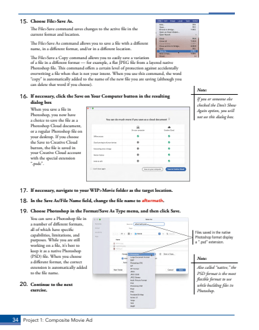 34 Project 1: Composite Movie Ad15. Choose File>Save As. The File>Save command saves changes to the active file in the current format and location.The File>Save As command allows you to save a file with a different name, in a different format, and/or in a different location.The File>Save a Copy command allows you to easily save a variation of a file in a different format %u2014 for example, a flat JPEG file from a layered native Photoshop file. This command offers a certain level of protection against accidentally overwriting a file when that is not your intent. When you use this command, the word %u201ccopy%u201d is automatically added to the name of the new file you are saving (although you can delete that word if you choose).16. If necessary, click the Save on Your Computer button in the resulting dialog boxWhen you save a file in Photoshop, you now have a choice to save the file as a Photoshop Cloud document, or a regular Photoshop file on your desktop. If you choose the Save to Creative Cloud button, the file is saved in your Creative Cloud account with the special extension %u201c.psdc%u201d.17. If necessary, navigate to your WIP>Movie folder as the target location. 18. In the Save As/File Name field, change the file name to aftermath.19. Choose Photoshop in the Format/Save As Type menu, and then click Save.You can save a Photoshop file in a number of different formats, all of which have specific capabilities, limitations, and purposes. While you are still working on a file, it%u2019s best to keep it as a native Photoshop (PSD) file. When you choose a different format, the correct extension is automatically added to the file name.20. Continue to the next exercise.Files saved in the native Photoshop format display a %u201c.psd%u201d extension.Note:Also called %u201cnative,%u201d the PSD format is the most flexible format to use while building files in Photoshop.Note:If you or someone else checked the Don%u2019t Show Again option, you will not see this dialog box.