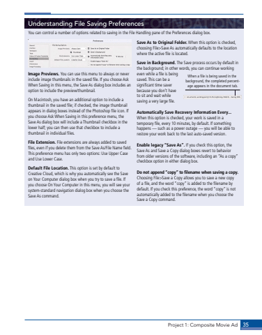 Project 1: Composite Movie Ad 35Understanding File Saving PreferencesYou can control a number of options related to saving in the File Handling pane of the Preferences dialog box.Image Previews. You can use this menu to always or never include image thumbnails in the saved file. If you choose Ask When Saving in this menu, the Save As dialog box includes an option to include the preview/thumbnail.On Macintosh, you have an additional option to include a thumbnail in the saved file; if checked, the image thumbnail appears in dialog boxes instead of the Photoshop file icon. If you choose Ask When Saving in this preference menu, the Save As dialog box will include a Thumbnail checkbox in the lower half; you can then use that checkbox to include a thumbnail in individual files. File Extension. File extensions are always added to saved files, even if you delete them from the Save As/File Name field. This preference menu has only two options: Use Upper Case and Use Lower Case.Default File Location. This option is set by default to Creative Cloud, which is why you automatically see the Save on Your Computer dialog box when you try to save a file. If you choose On Your Computer in this menu, you will see your system-standard navigation dialog box when you choose the Save As command.Save As to Original Folder. When this option is checked, choosing File>Save As automatically defaults to the location where the active file is located.Save in Background. The Save process occurs by default in the background; in other words, you can continue working even while a file is being saved. This can be a significant time saver because you don%u2019t have to sit and wait while saving a very large file. Automatically Save Recovery Information Every... When this option is checked, your work is saved in a temporary file, every 10 minutes, by default. If something happens %u2014 such as a power outage %u2014 you will be able to restore your work back to the last auto-saved version. Enable legacy %u201cSave As%u201d. If you check this option, the Save As and Save a Copy dialog boxes revert to behavior from older versions of the software, including an %u201cAs a copy%u201d checkbox option in either dialog box.Do not append %u201ccopy%u201d to filename when saving a copy.Choosing File>Save a Copy allows you to save a new copy of a file, and the word %u201ccopy%u201d is added to the filename by default. If you check this preference, the word %u201ccopy%u201d is not automatically added to the filename when you choose the Save a Copy command.When a file is being saved in the background, the completed percentage appears in the document tab.