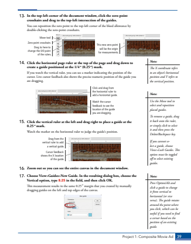 Project 1: Composite Movie Ad 3913. In the top-left corner of the document window, click the zero-point crosshairs and drag to the top-left intersection of the guides.You can reposition the zero point to the top-left corner of the bleed allowance by double-clicking the zero-point crosshairs.Zero-point crosshairsMove toolDrag to here to change the 0/0 point of the rulers.This new zero point will be the origin for measurements.14. Click the horizontal page ruler at the top of the page and drag down to create a guide positioned at the 1/4%u02dd (0.25%u02dd) mark.If you watch the vertical ruler, you can see a marker indicating the position of the cursor. Live cursor feedback also shows the precise numeric position of the guide you are dragging.Click and drag from the horizontal ruler to add a horizontal guide.Watch the cursor feedback to see the location of the guide you are dragging.15. Click the vertical ruler at the left and drag right to place a guide at the 0.25%u02dd%u00a0mark.Watch the marker on the horizontal ruler to judge the guide%u2019s position.Drag from the vertical ruler to add a vertical guide.Cursor feedback shows the X location of the guide.16. Zoom out so you can see the entire canvas in the document window.17. Choose View>Guides>New Guide. In the resulting dialog box, choose the Vertical option, type 8.25 in the field, and then click OK.This measurement results in the same 0.25%u02dd margin that you created by manually dragging guides on the left and top edges of the canvas.Note:Use the Move tool to select and reposition placed guides. To remove a guide, drag it back onto the ruler, or simply click to select it and then press the Delete/Backspace key.If you cannot select a guide, choose View>Lock Guides. This option must be toggled off to select existing guides.Note:Press Option/Alt and click a guide to change it from vertical to horizontal (or vice versa). The guide rotates around the point where you click, which can be useful if you need to find a corner based on the position of an existing guide.Note:The X coordinate refers to an object%u2019s horizontal position and Y refers to the vertical position.