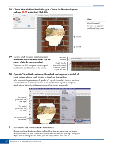 40 Project 1: Composite Movie Ad18. Choose View>Guides>New Guide again. Choose the Horizontal option and type 10.75 in the field. Click OK.Step 17Step 1819. Double-click the zero-point crosshairs (where the two rulers meet in the top-left corner of the document window). This resets the file%u2019s zero point to the original position (the top-left corner of the canvas).20. Open the View>Guides submenu. If no check mark appears to the left of Lock Guides, choose Lock Guides to toggle on that option.After you carefully position specific guides, it%u2019s a good idea to lock them so you don%u2019t accidentally move or delete them later. If you need to move a guide at any point, simply choose View>Lock Guides to toggle off the option temporarily.The inside guides mark the live area.The option should be checked.The outside guides mark the trim edge.21. Save the file and continue to the next exercise.Because you have already saved this working file with a new name, you can simply choose File>Save, or press Command/Control-S to save without opening a dialog box. If you want to change the file name, you can always choose File>Save As.Double-click the zero-point crosshair to reset the canvas%u2019s original zero point.Zero-pointcrosshairsNote:Press Command/Control-; to toggle the visibility of page guides.