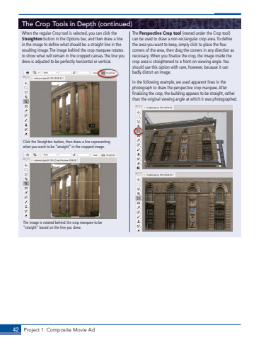 42 Project 1: Composite Movie AdThe Crop Tools in Depth (continued)When the regular Crop tool is selected, you can click the Straighten button in the Options bar, and then draw a line in the image to define what should be a straight line in the resulting image. The image behind the crop marquee rotates to show what will remain in the cropped canvas. The line you drew is adjusted to be perfectly horizontal or vertical.Click the Straighten button, then draw a line representing what you want to be %u201cstraight%u201d in the cropped image.The image is rotated behind the crop marquee to be %u201cstraight%u201d based on the line you drew.The Perspective Crop tool (nested under the Crop tool) can be used to draw a non-rectangular crop area. To define the area you want to keep, simply click to place the four corners of the area, then drag the corners in any direction as necessary. When you finalize the crop, the image inside the crop area is straightened to a front-on viewing angle. You should use this option with care, however, because it can badly distort an image.In the following example, we used apparent lines in the photograph to draw the perspective crop marquee. After finalizing the crop, the building appears to be straight, rather than the original viewing angle at which it was photographed.