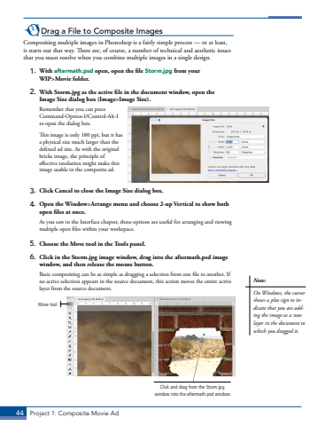 44 Project 1: Composite Movie AdDrag a File to Composite ImagesCompositing multiple images in Photoshop is a fairly simple process %u2014 or at least, it starts out that way. There are, of course, a number of technical and aesthetic issues that you must resolve when you combine multiple images in a single design. 1. With aftermath.psd open, open the file Storm.jpg from your WIP>Movie folder.2. With Storm.jpg as the active file in the document window, open the Image Size dialog box (Image>Image Size). Remember that you can press Command-Option-I/Control-Alt-I to open the dialog box.This image is only 180 ppi, but it has a physical size much larger than the defined ad size. As with the original bricks image, the principle of effective resolution might make this image usable in the composite ad.3. Click Cancel to close the Image Size dialog box.4. Open the Window>Arrange menu and choose 2-up Vertical to show both open files at once.As you saw in the Interface chapter, these options are useful for arranging and viewing multiple open files within your workspace. 5. Choose the Move tool in the Tools panel. 6. Click in the Storm.jpg image window, drag into the aftermath.psd image window, and then release the mouse button.Basic compositing can be as simple as dragging a selection from one file to another. If no active selection appears in the source document, this action moves the entire active layer from the source document.Move toolClick and drag from the Storm.jpg window into the aftermath.psd window.Note:On Windows, the cursor shows a plus sign to indicate that you are adding the image as a new layer in the document to which you dragged it.