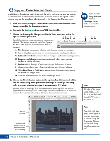 48 Project 1: Composite Movie AdCopy and Paste Selected PixelsIn addition to dragging an entire layer with the Move tool, you can also use a variety of selection tools to choose only certain areas of a layer that will be copied. In this exercise, you use the most basic selection tool %u2014 the Rectangular Marquee tool.1. With aftermath.psd open, choose View>Fit on Screen to show the entire image centered in the document window.2. Open the file Skyline.jpg from your WIP>Movie folder.3. Choose the Rectangular Marquee tool in the Tools panel and review the options in the Options bar.By default, dragging with a marquee tool creates a new selection. The buttons on the left end of the Options bar define what happens if you draw more than one marquee.A New Selection creates a new selection each time you create a new marquee.B Add to Selection adds the area of a new marquee to the existing selected area.C Subtract from Selection removes the new marquee area from the existing selection.D Intersect with Selection results in a selection only where a new marquee overlaps an existing selection.E Feather (soften) the edges of a selection by a specified number of pixels.F Choose a normal selection, a fixed-ratio selection, or a fixed-size selection.G When Fixed Ratio or Fixed Size is selected, enter the size of the selection in the Width and Height fields.H Click this button to reverse the Width and Height fields.4. Choose the New Selection option in the Options bar. Click outside of the top-left corner, drag down past the bottom edge of the image, and drag right to create a selection area that is approximately 8.5%u02dd wide.You can%u2019t select an area larger than the current canvas, so the top, left, and bottom edges of the selection snap to the canvas edges. The live cursor feedback, as well as the mark on the horizontal ruler, help to determine the selection area%u2019s width. Selection marqueeCursor feedback shows the size of the selection area you are drawing.Watch the videos Using Selection Tools in Photoshop, Parts 1 and 2 in your online student resources.A B C D E F G HNote:The edges of this image will be hidden by the bricks, so you don%u2019t need the full 8.75%u02dd width of the overall ad.Note:Press Shift while dragging a new marquee to constrain the selection to a square (using the Rectangular Marquee tool) or circle (using the Elliptical Marquee tool).