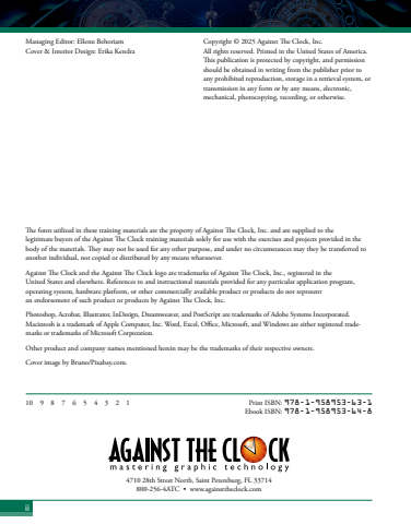 iiThe fonts utilized in these training materials are the property of Against The Clock, Inc. and are supplied to the legitimate buyers of the Against The Clock training materials solely for use with the exercises and projects provided in the body of the materials. They may not be used for any other purpose, and under no circumstances may they be transferred to another individual, nor copied or distributed by any means whatsoever.Against The Clock and the Against The Clock logo are trademarks of Against The Clock, Inc., registered in the United States and elsewhere. References to and instructional materials provided for any particular application program, operating system, hardware platform, or other commercially available product or products do not represent an endorsement of such product or products by Against The Clock, Inc. Photoshop, Acrobat, Illustrator, InDesign, Dreamweaver, and PostScript are trademarks of Adobe Systems Incorporated. Macintosh is a trademark of Apple Computer, Inc. Word, Excel, Office, Microsoft, and Windows are either registered trademarks or trademarks of Microsoft Corporation. Other product and company names mentioned herein may be the trademarks of their respective owners.Cover image by Bruno/Pixabay.com.4710 28th Street North, Saint Petersburg, FL 33714800-256-4ATC %u2022 www.againsttheclock.com10 9 8 7 6 5 4 3 2 1 Print ISBN: 978-1-958953-63-1Ebook ISBN: 978-1-958953-64-8Managing Editor: Ellenn BehoriamCover & Interior Design: Erika KendraCopyright %u00a9 2025 Against The Clock, Inc. All rights reserved. Printed in the United States of America. This publication is protected by copyright, and permission should be obtained in writing from the publisher prior to any prohibited reproduction, storage in a retrieval system, or transmission in any form or by any means, electronic, mechanical, photocopying, recording, or otherwise.