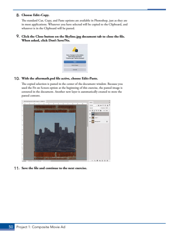 50 Project 1: Composite Movie Ad8. Choose Edit>Copy.The standard Cut, Copy, and Paste options are available in Photoshop, just as they are in most applications. Whatever you have selected will be copied to the Clipboard, and whatever is in the Clipboard will be pasted.9. Click the Close button on the Skyline.jpg document tab to close the file. When asked, click Don%u2019t Save/No.10. With the aftermath.psd file active, choose Edit>Paste.The copied selection is pasted in the center of the document window. Because you used the Fit on Screen option at the beginning of this exercise, the pasted image is centered in the document. Another new layer is automatically created to store the pasted content.11. Save the file and continue to the next exercise.