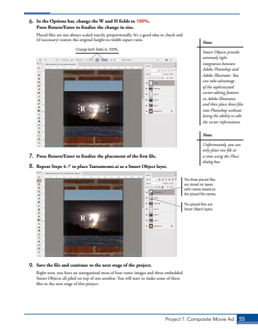 Project 1: Composite Movie Ad 556. In the Options bar, change the W and H fields to 100%. Press Return/Enter to finalize the change in size.Placed files are not always scaled exactly proportionally. It%u2019s a good idea to check and (if%u00a0necessary) restore the original height-to-width aspect ratio.Change both fields to 100%.7. Press Return/Enter to finalize the placement of the first file.8. Repeat Steps 4%u20137 to place Tantamount.ai as a Smart Object layer.The three placed files are stored on layers with names based on the placed file names.The placed files are Smart Object layers.9. Save the file and continue to the next stage of the project.Right now, you have an unorganized mess of four raster images and three embedded Smart Objects all piled on top of one another. You will start to make sense of these files in the next stage of this project.Note:Unfortunately, you can only place one file at a time using the Place dialog box.Note:Smart Objects provide extremely tight integration between Adobe Photoshop and Adobe Illustrator. You can take advantage of the sophisticated vector-editing features in Adobe Illustrator, and then place those files into Photoshop without losing the ability to edit the vector information.
