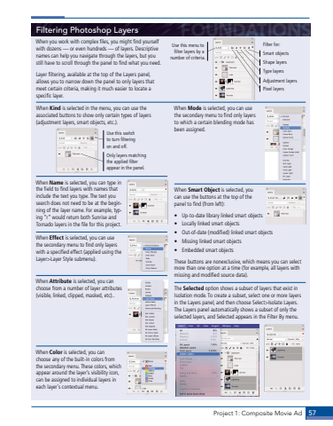 Project 1: Composite Movie Ad 57Filtering Photoshop LayersWhen you work with complex files, you might find yourself with dozens %u2014 or even hundreds %u2014 of layers. Descriptive names can help you navigate through the layers, but you still have to scroll through the panel to find what you need.Layer filtering, available at the top of the Layers panel, allows you to narrow down the panel to only layers that meet certain criteria, making it much easier to locate a specific layer.When Kind is selected in the menu, you can use the associated buttons to show only certain types of layers (adjustment layers, smart objects, etc.).Use this switch to turn filtering on and off.Only layers matching the applied filter appear in the panel.When Name is selected, you can type in the field to find layers with names that include the text you type. The text you search does not need to be at the beginning of the layer name. For example, typing %u201cr%u201d would return both Sunrise and Tornado layers in the file for this project.When Effect is selected, you can use the secondary menu to find only layers with a specified effect (applied using the Layer>Layer Style submenu).When Attribute is selected, you can choose from a number of layer attributes (visible, linked, clipped, masked, etc)..When Color is selected, you can choose any of the built-in colors from the secondary menu. These colors, which appear around the layer%u2019s visibility icon, can be assigned to individual layers in each layer%u2019s contextual menu.When Mode is selected, you can use the secondary menu to find only layers to which a certain blending mode has been assigned.When Smart Object is selected, you can use the buttons at the top of the panel to find (from left):%u2022 Up-to-date library linked smart objects%u2022 Locally linked smart objects %u2022 Out-of-date (modified) linked smart objects%u2022 Missing linked smart objects%u2022 Embedded smart objectsThese buttons are nonexclusive, which means you can select more than one option at a time (for example, all layers with missing and modified source data).The Selected option shows a subset of layers that exist in Isolation mode. To create a subset, select one or more layers in the Layers panel, and then choose Select>Isolate Layers. The Layers panel automatically shows a subset of only the selected layers, and Selected appears in the Filter By menu. Use this menu to filter layers by a number of criteria.Pixel layersFilter for:Adjustment layersType layersShape layersSmart objects