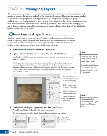 58 Project 1: Composite Movie AdSTAGE 2 / Managing LayersWhen you composite images into a cohesive design, you almost certainly need to manipulate and transform some of the layers to make all of the pieces work together. Photoshop includes a number of options for managing layers: naming layers for easier recognition, creating layer groups so multiple layers can be manipulated at once, moving layers around on the canvas, transforming layers both destructively and nondestructively, controlling individual layer visibility, and arranging the top-to-bottom stacking order of layers to determine exactly what is visible. You will use all of these options in this stage of the project. Name Layers and Layer GroupsIt%u2019s always a good idea to name your layers because it makes managing the file much easier %u2014 especially when you work with files that include dozens of layers. Even with only four unnamed layers in this file (counting the Background layer), it would be tedious to have to toggle each layer on to find the one you want.1. With aftermath.psd open, review the Layers panel.2. Option/Alt-click the Eye icon for Layer 1 to hide all other layers.Toggling layer visibility is an easy way to see only what you want to see at any given stage in a project. Clicking the Eye icon for a specific layer hides that layer. Clicking the empty space where the Eye icon should be shows the hidden layer. To show or hide a series of consecutive layers, click the visibility icon (or empty space) for the first layer you want to affect, hold down the mouse button, and drag up or down to the last layer you want to show or hide. Click the Eye icons to hide individual layers.Option/Alt-click an Eye icon to hide all other layers.Click an empty space to show a hidden layer.The checked pattern shows transparent areas of the visible layer(s).3. Double-click the Layer 1 layer name, and then type Storm. Press Return/Enter to finalize the new layer name.You can rename any layer by simply double-clicking the name and typing. Double-click the layer name to access it.Press Return/Enter after typing to finalize the new name.Note:Press Shift and click to select consecutive layers in the Layers panel.Press Command/Control and click to select nonconsecutive layers in the Layers panel.Note:You can also choose New Group from Layers in the panel Options menu.
