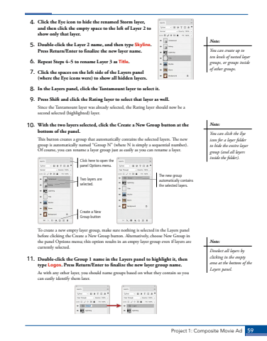 Project 1: Composite Movie Ad 594. Click the Eye icon to hide the renamed Storm layer, and then click the empty space to the left of Layer 2 to show only that layer.5. Double-click the Layer 2 name, and then type Skyline. Press Return/Enter to finalize the new layer name.6. Repeat Steps 4%u20135 to rename Layer 3 as Title.7. Click the spaces on the left side of the Layers panel (where the Eye icons were) to show all hidden layers.8. In the Layers panel, click the Tantamount layer to select it. 9. Press Shift and click the Rating layer to select that layer as well. Since the Tantamount layer was already selected, the Rating layer should now be a second selected (highlighted) layer. 10. With the two layers selected, click the Create a New Group button at the bottom of the panel.This button creates a group that automatically contains the selected layers. The new group is automatically named %u201cGroup N%u201d (where N is simply a sequential number). Of course, you can rename a layer group just as easily as you can rename a layer.Create a New Group buttonTwo layers are selected.Click here to open the panel Options menu.The new group automatically contains the selected layers.To create a new empty layer group, make sure nothing is selected in the Layers panel before clicking the Create a New Group button. Alternatively, choose New Group in the panel Options menu; this option results in an empty layer group even if layers are currently selected.11. Double-click the Group 1 name in the Layers panel to highlight it, then type Logos. Press Return/Enter to finalize the new layer group name. As with any other layer, you should name groups based on what they contain so you can easily identify them later.Note:You can create up to ten levels of nested layer groups, or groups inside of other groups.Note:You can click the Eye icon for a layer folder to hide the entire layer group (and all layers inside the folder).Note:Deselect all layers by clicking in the empty area at the bottom of the Layers panel.