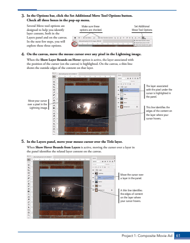 Project 1: Composite Movie Ad 613. In the Options bar, click the Set Additional Move Tool Options button. Check all three boxes in the pop-up menu.Several Move tool options are designed to help you identify layer content, both in the Layers panel and on the canvas. In the next few steps, you will explore these three options.4. On the canvas, move the mouse cursor over any pixel in the Lightning image. When the Show Layer Bounds on Hover option is active, the layer associated with the position of the cursor (on the canvas) is highlighted. On the canvas, a thin line shows the outside edges of the content on that layer.The layer associated with the pixel under the cursor is highlighted in the panel.This line identifies the edges of the content on the layer where your cursor hovers.Move your cursor over a pixel in the Lightning image.5. In the Layers panel, move your mouse cursor over the Title layer.When Show Hover Bounds from Layers is active, moving the cursor over a layer in the panel identifies the related layer content on the canvas. A thin line identifies the edges of content on the layer where your cursor hovers.Move the cursor over a layer in the panel.Set Additional Move Tool OptionsMake sure these options are checked.