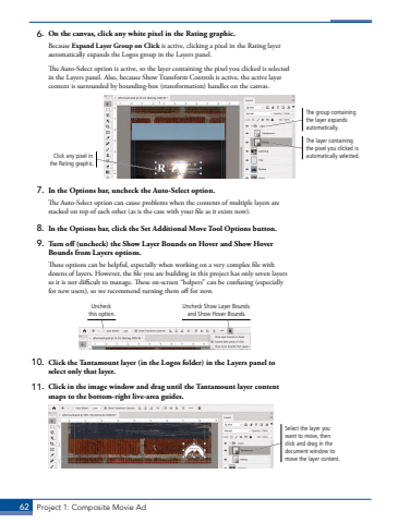 62 Project 1: Composite Movie Ad6. On the canvas, click any white pixel in the Rating graphic.Because Expand Layer Group on Click is active, clicking a pixel in the Rating layer automatically expands the Logos group in the Layers panel. The Auto-Select option is active, so the layer containing the pixel you clicked is selected in the Layers panel. Also, because Show Transform Controls is active, the active layer content is surrounded by bounding-box (transformation) handles on the canvas.The layer containing the pixel you clicked is automatically selected.The group containing the layer expands automatically.Click any pixel in the Rating graphic.7. In the Options bar, uncheck the Auto-Select option.The Auto-Select option can cause problems when the contents of multiple layers are stacked on top of each other (as is the case with your file as it exists now).8. In the Options bar, click the Set Additional Move Tool Options button.9. Turn off (uncheck) the Show Layer Bounds on Hover and Show Hover Bounds from Layers options.These options can be helpful, especially when working on a very complex file with dozens of layers. However, the file you are building in this project has only seven layers so it is not difficult to manage. These on-screen %u201chelpers%u201d can be confusing (especially for new users), so we recommend turning them off for now.Uncheck Show Layer Bounds and Show Hover Bounds.Uncheck this option.10. Click the Tantamount layer (in the Logos folder) in the Layers panel to select only that layer.11. Click in the image window and drag until the Tantamount layer content snaps to the bottom-right live-area guides.Select the layer you want to move, then click and drag in the document window to move the layer content.