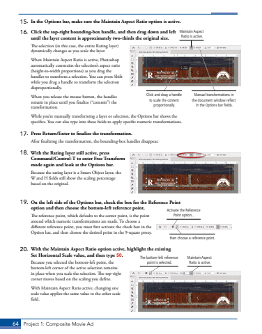 64 Project 1: Composite Movie Ad15. In the Options bar, make sure the Maintain Aspect Ratio option is active.16. Click the top-right bounding-box handle, and then drag down and left until the layer content is approximately two-thirds the original size.The selection (in this case, the entire Rating layer) dynamically changes as you scale the layer. When Maintain Aspect Ratio is active, Photoshop automatically constrains the selection%u2019s aspect ratio (height-to-width proportions) as you drag the handles to transform a selection. You can press Shift while you drag a handle to transform the selection disproportionally.When you release the mouse button, the handles remain in place until you finalize (%u201ccommit%u201d) the transformation.While you%u2019re manually transforming a layer or selection, the Options bar shows the specifics. You can also type into these fields to apply specific numeric transformations.17. Press Return/Enter to finalize the transformation.After finalizing the transformation, the bounding-box handles disappear.18. With the Rating layer still active, press Command/Control-T to enter Free%u00a0Transform mode again and look at the Options bar.Because the rating layer is a Smart Object layer, the W and H fields still show the scaling percentage based on the original. 19. On the left side of the Options bar, check the box for the Reference Point option and then choose the bottom-left reference point.The reference point, which defaults to the center point, is the point around which numeric transformations are made. To choose a different reference point, you must first activate the check box in the Option bar, and then choose the desired point in the 9-square proxy.20. With the Maintain Aspect Ratio option active, highlight the existing Set Horizontal Scale value, and then type 50.Because you selected the bottom-left point, the bottom-left corner of the active selection remains in place when you scale the selection. The top-right corner moves based on the scaling you define. With Maintain Aspect Ratio active, changing one scale value applies the same value to the other scale field. Click and drag a handle to scale the content proportionally.Manual transformations in the document window reflect in the Options bar fields.Maintain Aspect Ratio is active.then choose a reference point. Activate the Reference Point option...Maintain Aspect Ratio is active.The bottom-left reference point is selected.