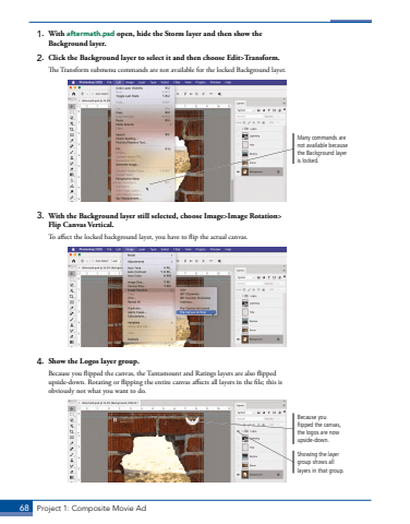 68 Project 1: Composite Movie Ad1. With aftermath.psd open, hide the Storm layer and then show the Background layer.2. Click the Background layer to select it and then choose Edit>Transform.The Transform submenu commands are not available for the locked Background layer. Many commands are not available because the Background layer is locked.3. With the Background layer still selected, choose Image>Image Rotation> Flip Canvas Vertical.To affect the locked background layer, you have to flip the actual canvas.4. Show the Logos layer group.Because you flipped the canvas, the Tantamount and Ratings layers are also flipped upside-down. Rotating or flipping the entire canvas affects all layers in the file; this is obviously not what you want to do.Showing the layer group shows all layers in that group.Because you flipped the canvas, the logos are now upside-down.