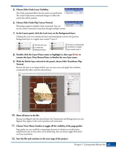 Project 1: Composite Movie Ad 695. Choose Edit>Undo Layer Visibility.The Undo command affects the last action you performed. The actual Undo menu command changes to reflect the action that will be undone. 6. Choose Edit>Undo Flip Canvas Vertical.Photoshop supports multiple Undo commands. You can use the Undo command to step back through multiple actions.7. In the Layers panel, click the Lock icon on the Background layer.Clicking the Lock icon unlocks the layer and immediately converts the previous Background layer to a regular layer named %u201cLayer 0.%u201d Click the Lock icon to unlock the Background layer.The layer is automatically converted to a regular layer named Layer 0.8. Double-click the Layer 0 layer name to highlight it, then type Bricks to rename the layer. Press Return/Enter to finalize the new layer name.9. With the Bricks layer selected in the panel, choose Edit>Transform>Flip Vertical.Because the layer is no longer locked, you can now access and apply the transform commands that affect only the selected layer.10. Show all layers in the file.Because you flipped only the selected layer, the Tantamount and Ratings layers are not flipped; they appear in the correct position and orientation.11. Choose View>Show>Guides to toggle off the visibility of the page guides.Page guides are very useful for compositing elements in relation to overall project requirements, but at times they can be distracting. You can always toggle them back on if you need them.12. Save the file and continue to the next stage of the project.