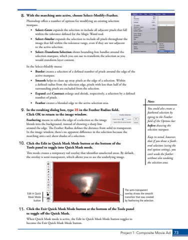 Project 1: Composite Movie Ad 738. With the marching ants active, choose Select>Modify>Feather.Photoshop offers a number of options for modifying an existing selection marquee. %u2022 Select>Grow expands the selection to include all adjacent pixels that fall within the tolerance defined for the Magic Wand tool.%u2022 Select>Similar expands the selection to include all pixels throughout the image that fall within the tolerance range, even if they are not adjacent to the active selection.%u2022 Select>Transform Selection shows bounding-box handles around the selection marquee, which you can use to transform the selection as you would transform layer content.In the Select>Modify menu: %u2022 Border creates a selection of a defined number of pixels around the edge of the active marquee.%u2022 Smooth helps to clean up stray pixels at the edge of a selection. Within a defined radius from the selection edge, pixels with less than half of the surrounding pixels are excluded from the selection.%u2022 Expand and Contract enlarge and shrink, respectively, a selection by a defined number of pixels.%u2022 Feather creates a blended edge to the active selection area.9. In the resulting dialog box, type 35 in the Feather Radius field. Click OK to return to the image window.Feathering means to soften the edge of a selection so the image blends into the background, instead of showing a sharp line around the edge. The Feather Radius defines the distance from solid to transparent. In the image window, there%u2019s no apparent difference in the selection because the marching ants can%u2019t show shades of a selection. 10. Click the Edit in Quick Mask Mode button at the bottom of the Tools panel to toggle into Quick Mask mode.This mode creates a temporary red overlay that identifies unselected areas. By default, the overlay is semi-transparent, which allows you to see the underlying image. Edit in Quick Mask Mode buttonThe semi-transparent overlay shows the smooth transition that was created by feathering the selection.11. Click the Exit Quick Mask Mode button at the bottom of the Tools panel to toggle off the Quick Mask.When Quick Mask mode is active, the Edit in Quick Mask Mode button toggles to become the Exit Quick Mask Mode button.Note:You could also create a feathered selection by typing in the Feather field of the Options bar before drawing the selection marquee.Keep in mind, however, that if you draw a feathered selection (using the tool option setting), you can%u2019t undo the feather without also undoing the selection area.