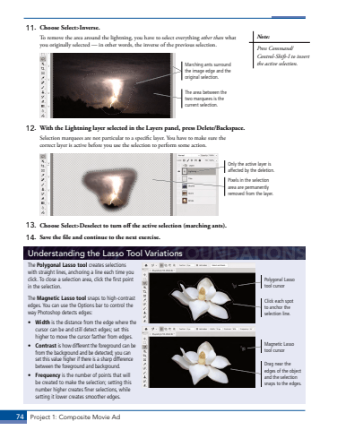 74 Project 1: Composite Movie Ad11. Choose Select>Inverse.To remove the area around the lightning, you have to select everything other than what you originally selected %u2014 in other words, the inverse of the previous selection.Marching ants surround the image edge and the original selection.The area between the two marquees is the current selection.12. With the Lightning layer selected in the Layers panel, press Delete/Backspace.Selection marquees are not particular to a specific layer. You have to make sure the correct layer is active before you use the selection to perform some action.Pixels in the selection area are permanently removed from the layer.Only the active layer is affected by the deletion.13. Choose Select>Deselect to turn off the active selection (marching ants).14. Save the file and continue to the next exercise.Note:Press Command/Control-Shift-I to invert the active selection.Understanding the Lasso Tool VariationsThe Polygonal Lasso tool creates selections with straight lines, anchoring a line each time you click. To close a selection area, click the first point in the selection.The Magnetic Lasso tool snaps to high-contrast edges. You can use the Options bar to control the way Photoshop detects edges: %u2022 Width is the distance from the edge where the cursor can be and still detect edges; set this higher to move the cursor farther from edges. %u2022 Contrast is how different the foreground can be from the background and be detected; you can set this value higher if there is a sharp difference between the foreground and background. %u2022 Frequency is the number of points that will be created to make the selection; setting this number higher creates finer selections, while setting it lower creates smoother edges.Polygonal Lasso tool cursorMagnetic Lasso tool cursorDrag near the edges of the object and the selection snaps to the edges.Click each spot to anchor the selection line.