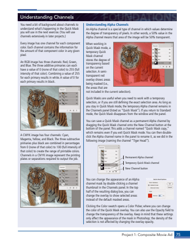 Project 1: Composite Movie Ad 75You need a bit of background about channels to understand what%u2019s happening in the Quick Mask you will use in the next exercise. (You will use channels extensively in later projects.)Every image has one channel for each component color. Each channel contains the information for the amount of that component color in any given pixel. An RGB image has three channels: Red, Green, and Blue. The three additive primaries can each have a value of 0 (none of that color) to 255 (full intensity of that color). Combining a value of 255 for each primary results in white. A value of 0 for each primary results in black.A CMYK image has four channels: Cyan, Magenta, Yellow, and Black. The three subtractive primaries plus black are combined in percentages from 0 (none of that color) to 100 (full intensity of that color) to create the range of printable colors. Channels in a CMYK image represent the printing plates or separations required to output the job.Understanding Alpha ChannelsAn Alpha channel is a special type of channel in which values determine the degree of transparency of pixels. In other words, a 50% value in the Alpha channel means that area of the image will be 50% transparent.When working in Quick Mask mode, a temporary Quick Mask channel stores the degree of transparency based on the current selection. A semitransparent red overlay shows areas being masked (i.e., the areas that are not included in the current selection).Quick Masks are useful when you need to work with a temporary selection, or if you are still defining the exact selection area. As long as you stay in Quick Mask mode, the temporary Alpha channel remains in the Channels panel (listed as %u201cQuick Mask%u201d). If you return to Standard mode, the Quick Mask disappears from the window and the panel.You can save a Quick Mask channel as a permanent Alpha channel by dragging the Quick Mask channel onto the New Channel button at the bottom of the panel. This adds a channel named %u201cQuick Mask copy,%u201d which remains even if you exit Quick Mask mode. You can then doubleclick the Alpha channel name in the panel to rename it, as we did in the following image (naming the channel %u201cTiger Head%u201d).Permanent Alpha channelTemporary Quick Mask channelNew Channel buttonYou can change the appearance of an Alpha channel mask by double-clicking a channel thumbnail in the Channels panel. In the top half of the resulting dialog box, you can change the overlay to show selected areas instead of the default masked areas. Clicking the Color swatch opens a Color Picker, where you can change the color of the Quick Mask overlay. You can also use the Opacity field to change the transparency of the overlay. Keep in mind that these settings only affect the appearance of the mask in Photoshop; the density of the selection is not affected by changing the overlay opacity.Understanding Channels
