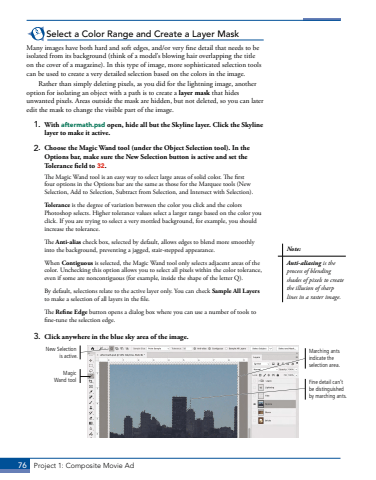 76 Project 1: Composite Movie AdSelect a Color Range and Create a Layer MaskMany images have both hard and soft edges, and/or very fine detail that needs to be isolated from its background (think of a model%u2019s blowing hair overlapping the title on the cover of a magazine). In this type of image, more sophisticated selection tools can be used to create a very detailed selection based on the colors in the image.Rather than simply deleting pixels, as you did for the lightning image, another option for isolating an object with a path is to create a layer mask that hides unwanted pixels. Areas outside the mask are hidden, but not deleted, so you can later edit the mask to change the visible part of the image. 1. With aftermath.psd open, hide all but the Skyline layer. Click the Skyline layer to make it active.2. Choose the Magic Wand tool (under the Object Selection tool). In the Options bar, make sure the New Selection button is active and set the Tolerance field to 32.The Magic Wand tool is an easy way to select large areas of solid color. The first four options in the Options bar are the same as those for the Marquee tools (New Selection, Add to Selection, Subtract from Selection, and Intersect with Selection).Tolerance is the degree of variation between the color you click and the colors Photoshop selects. Higher tolerance values select a larger range based on the color you click. If you are trying to select a very mottled background, for example, you should increase the tolerance. The Anti-alias check box, selected by default, allows edges to blend more smoothly into the background, preventing a jagged, stair-stepped appearance.When Contiguous is selected, the Magic Wand tool only selects adjacent areas of the color. Unchecking this option allows you to select all pixels within the color tolerance, even if some are noncontiguous (for example, inside the shape of the letter Q).By default, selections relate to the active layer only. You can check Sample All Layersto make a selection of all layers in the file. The Refine Edge button opens a dialog box where you can use a number of tools to fine-tune the selection edge. 3. Click anywhere in the blue sky area of the image.Magic Wand toolNew Selection is active. Marching ants indicate the selection area.Fine detail can%u2019t be distinguished by marching ants.Note:Anti-aliasing is the process of blending shades of pixels to create the illusion of sharp lines in a raster image.