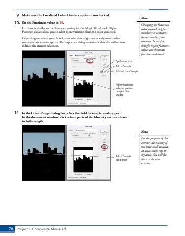 78 Project 1: Composite Movie Ad9. Make sure the Localized Color Clusters option is unchecked.10. Set the Fuzziness value to 70.Fuzziness is similar to the Tolerance setting for the Magic Wand tool. Higher Fuzziness values allow you to select more variation from the color you click.Depending on where you clicked, your selection might not exactly match what you see in our screen capture. The important thing to notice is that the visible areas indicate the current selection.Higher Fuzziness selects a greater range of blue shades.Eyedropper toolAdd to SampleSubtract from Sample11. In the Color Range dialog box, click the Add to Sample eyedropper. In the document window, click where parts of the blue sky are not shown in full strength. Add to Sample eyedropperNote:Changing the Fuzziness value expands (higher numbers) or contracts (lower numbers) the selection. Be careful, though; higher fuzziness values can eliminate fine lines and detail.Note:For the purposes of this exercise, don%u2019t worry if you have small unselected areas in the city or sky areas. You will fix these in the next exercise.