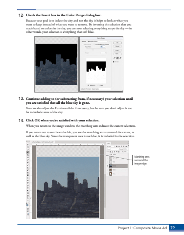 Project 1: Composite Movie Ad 7912. Check the Invert box in the Color Range dialog box.Because your goal is to isolate the city and not the sky, it helps to look at what you want to keep instead of what you want to remove. By inverting the selection that you made based on colors in the sky, you are now selecting everything except the sky %u2014 in other words, your selection is everything that isn%u2019t blue.13. Continue adding to (or subtracting from, if necessary) your selection until you are satisfied that all the blue sky is gone. You can also adjust the Fuzziness slider if necessary, but be sure you don%u2019t adjust it too far to include areas of the city.14. Click OK when you%u2019re satisfied with your selection.When you return to the image window, the marching ants indicate the current selection. If you zoom out to see the entire file, you see the marching ants surround the canvas, as well as the blue sky. Since the transparent area is not blue, it is included in the selection.Marching ants surround the image edge.