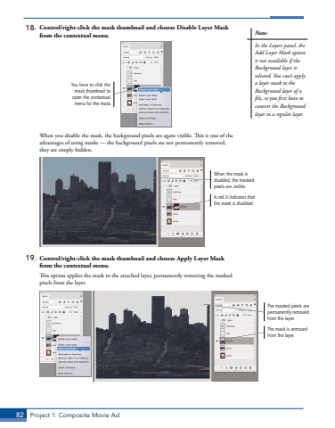 82 Project 1: Composite Movie Ad18. Control/right-click the mask thumbnail and choose Disable Layer Mask from the contextual menu.You have to click the mask thumbnail to open the contextual menu for the mask.When you disable the mask, the background pixels are again visible. This is one of the advantages of using masks %u2014 the background pixels are not permanently removed, they are simply hidden. A red X indicates that the mask is disabled.When the mask is disabled, the masked pixels are visible.19. Control/right-click the mask thumbnail and choose Apply Layer Mask from the contextual menu.This option applies the mask to the attached layer, permanently removing the masked pixels from the layer.The masked pixels are permanently removed from the layer.The mask is removed from the layer.Note:In the Layers panel, the Add Layer Mask option is not available if the Background layer is selected. You can%u2019t apply a layer mask to the Background layer of a file, so you first have to convert the Background layer to a regular layer.