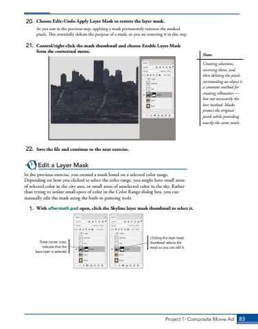 Project 1: Composite Movie Ad 83Note:Creating selections, reversing them, and then deleting the pixels surrounding an object is a common method for creating silhouettes %u2014 but not necessarily the best method. Masks protect the original pixels while providing exactly the same result. 20. Choose Edit>Undo Apply Layer Mask to restore the layer mask.As you saw in the previous step, applying a mask permanently removes the masked pixels. This essentially defeats the purpose of a mask, so you are restoring it in this step.21. Control/right-click the mask thumbnail and choose Enable Layer Mask from the contextual menu.22. Save the file and continue to the next exercise.Edit a Layer MaskIn the previous exercise, you created a mask based on a selected color range. Depending on how you clicked to select the color range, you might have small areas of selected color in the city area, or small areas of unselected color in the sky. Rather than trying to isolate small spots of color in the Color Range dialog box, you can manually edit the mask using the built-in painting tools.1. With aftermath.psd open, click the Skyline layer mask thumbnail to select it.Clicking the layer mask thumbnail selects the mask so you can edit it.These corner icons indicate that the base layer is selected.