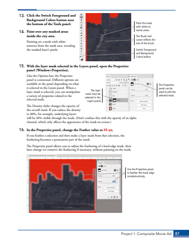Project 1: Composite Movie Ad 8713. Click the Switch Foreground and Background Colors button near the bottom of the Tools panel.14. Paint over any masked areas inside the city area.Painting on a mask with white removes from the mask area, revealing the masked layer%u2019s pixels. 15. With the layer mask selected in the Layers panel, open the Properties panel (Window>Properties). Like the Options bar, the Properties panel is contextual. Different options are available in the panel depending on what is selected in the Layers panel. When a layer mask is selected, you can manipulate a variety of properties related to the selected mask.The Density slider changes the opacity of the overall mask. If you reduce the density to 80%, for example, underlying layers will be 20% visible through the mask. (Don%u2019t confuse this with the opacity of an alpha channel, which only affects the appearance of the mask on screen.)16. In the Properties panel, change the Feather value to 25 px.If you feather a selection and then make a layer mask from that selection, the feathering becomes a permanent part of the mask.The Properties panel allows you to adjust the feathering of a hard-edge mask, then later change (or remove) the feathering if necessary, without painting on the mask.Use the Properties panel to feather the mask edge nondestructively.Paint the mask with white to reveal areas.The Brush tool cursor reflects the size of the brush.Switch Foreground and Background Colors buttonThe Properties panel can be used to edit the selected mask.The layer mask must be selected in the Layers panel.