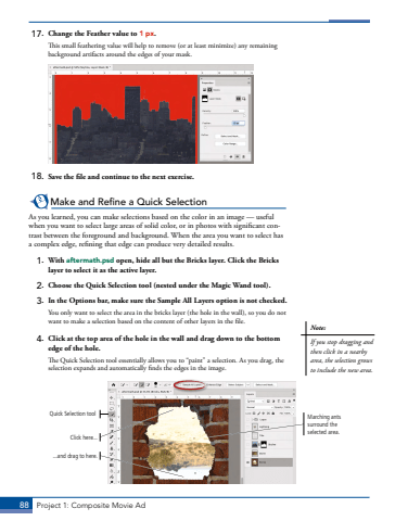 88 Project 1: Composite Movie Ad17. Change the Feather value to 1 px.This small feathering value will help to remove (or at least minimize) any remaining background artifacts around the edges of your mask.18. Save the file and continue to the next exercise.Make and Refine a Quick SelectionAs you learned, you can make selections based on the color in an image %u2014 useful when you want to select large areas of solid color, or in photos with significant contrast between the foreground and background. When the area you want to select has a complex edge, refining that edge can produce very detailed results.1. With aftermath.psd open, hide all but the Bricks layer. Click the Bricks layer to select it as the active layer.2. Choose the Quick Selection tool (nested under the Magic Wand tool).3. In the Options bar, make sure the Sample All Layers option is not checked. You only want to select the area in the bricks layer (the hole in the wall), so you do not want to make a selection based on the content of other layers in the file.4. Click at the top area of the hole in the wall and drag down to the bottom edge of the hole.The Quick Selection tool essentially allows you to %u201cpaint%u201d a selection. As you drag, the selection expands and automatically finds the edges in the image. Quick Selection toolClick here......and drag to here.Marching ants surround the selected area.Note:If you stop dragging and then click in a nearby area, the selection grows to include the new area.