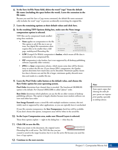 Project 1: Composite Movie Ad 956. In the Save As/File Name field, delete the word %u201ccopy%u201d from the default file name (including the space before the word). Leave the extension in the file name. Because you used the Save a Copy menu command, the default file name automatically includes the word %u201ccopy%u201d to prevent accidentally overwriting the original file. 7. Leave the remaining options at their default values and click Save.8. In the resulting TIFF Options dialog box, make sure the None image compression option is selected.TIFF files can be compressed (made smaller) using three methods:%u2022 None applies no compression to the file. This option is safe if file size is not an issue, but digital file transmission often requires files to be smaller than a fullpage, multilayered Photoshop file.%u2022 LZW (Lempel-Ziv-Welch) compression is lossless, which means all file data is maintained in the compressed file. %u2022 ZIP compression is also lossless, but is not supported by all desktop-publishing software (especially older versions). %u2022 JPEG is a lossy compression scheme, which means some data will be thrown away to reduce the file size. If you choose JPEG compression, the Quality options determine how much data can be discarded. Maximum quality means less data is thrown out and the file is larger; minimum quality discards more data and results in a smaller file size.9. Leave the Pixel Order radio button at the default value, and choose the Byte Order option for your operating system.Pixel Order determines how channel data is encoded. The Interleaved (RGBRGB) option is the default. Per Channel (RRGGBB) is called %u201cplanar%u201d order.Byte Order determines which platform can use the file on older versions of desktop publishing software. This option is largely obsolete because most modern software can now read either byte order. Save Image Pyramid creates a tiered file with multiple resolution versions; this isn%u2019t widely used or supported by other applications, so you can typically leave it unchecked. If your file contains transparency, the Save Transparency check box will be available. If you don%u2019t choose this option, transparent areas will be white in the saved file.10. In the Layer Compression area, make sure Discard Layers is selected.These three options explain %u2014 right in the dialog box %u2014 what they do.11. Click OK to save the file.When you return to the document, the original native Photoshop file is still active. The TIFF file that you just created is saved in the target location, but it is not the active file because you used the Save a Copy option. 12. Continue to the next exercise.Note:Some experts argue that choosing the order for your system can improve print quality, especially on desktop devices.