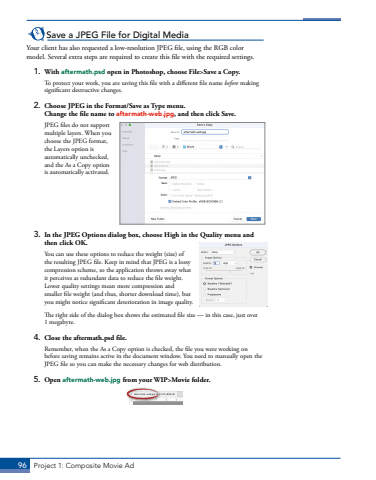 96 Project 1: Composite Movie AdSave a JPEG File for Digital MediaYour client has also requested a low-resolution JPEG file, using the RGB color model. Several extra steps are required to create this file with the required settings. 1. With aftermath.psd open in Photoshop, choose File>Save a Copy. To protect your work, you are saving this file with a different file name before making significant destructive changes. 2. Choose JPEG in the Format/Save as Type menu. Change the file name to aftermath-web.jpg, and then click Save.JPEG files do not support multiple layers. When you choose the JPEG format, the Layers option is automatically unchecked, and the As a Copy option is automatically activated.3. In the JPEG Options dialog box, choose High in the Quality menu and then click OK.You can use these options to reduce the weight (size) of the resulting JPEG file. Keep in mind that JPEG is a lossy compression scheme, so the application throws away what it perceives as redundant data to reduce the file weight. Lower quality settings mean more compression and smaller file weight (and thus, shorter download time), but you might notice significant deterioration in image quality.The right side of the dialog box shows the estimated file size %u2014 in this case, just over 1%u00a0megabyte.4. Close the aftermath.psd file.Remember, when the As a Copy option is checked, the file you were working on before saving remains active in the document window. You need to manually open the JPEG file so you can make the necessary changes for web distribution.5. Open aftermath-web.jpg from your WIP>Movie folder.