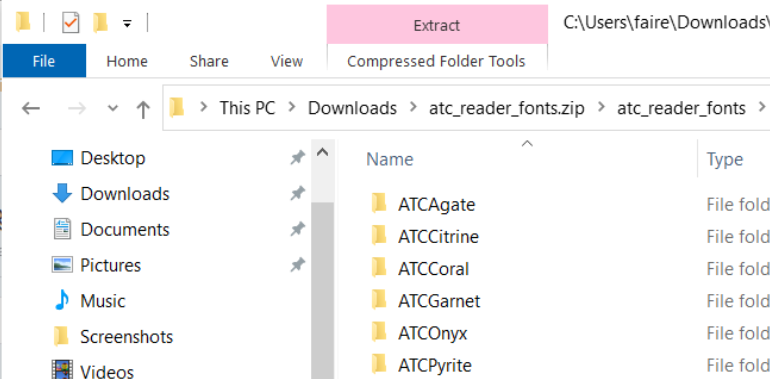 - Locate the file atc_reader_fonts.zip on your computer; it is most likely in your Downloads folder.